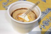 “B級グルメ”ならぬB級スイーツをイメージして作りました。パンの耳をラスク状に焼き上げ、その上にジェラートと苺をのせました。見てください、おいしそうでしょう!寒い日にこれだけ売れたのですから、もちろん商品化決定です。