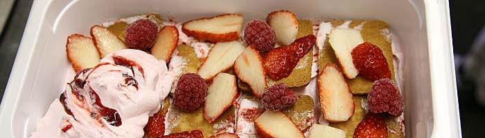 ▼見てください、アイスクリームの中にたっぷりベリーやタルトクッキーを入れました。 |