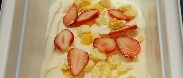▼アイスの中には自家製チーズケーキとフレッシュ苺がたっぷり。 |