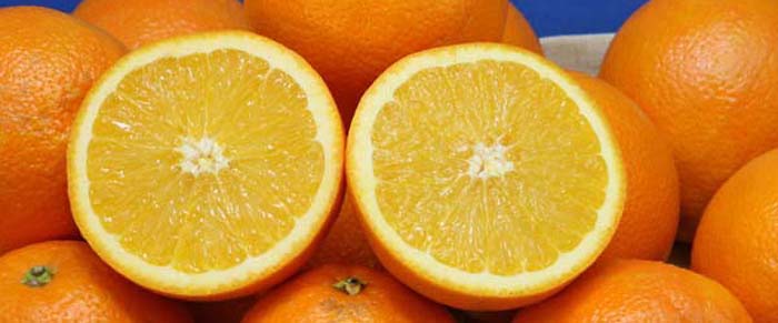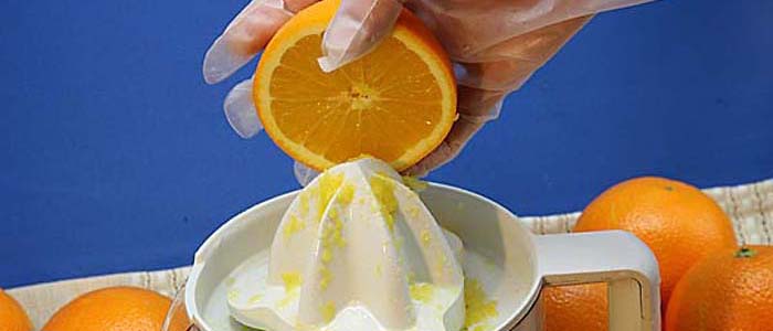 ▼輪切りにしたオレンジから果汁を取り出します。 |